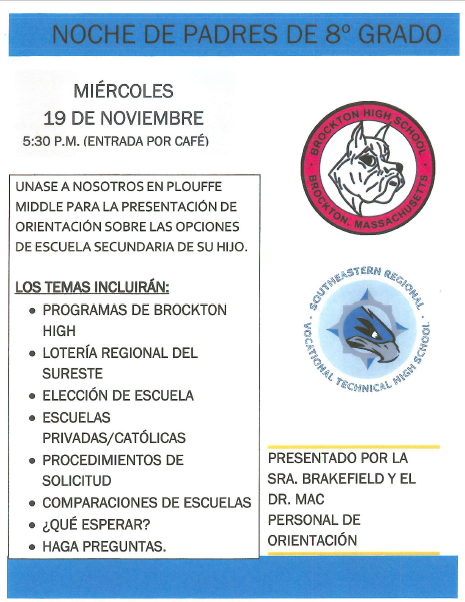 Please join us for a high school information night for Grade 8 students and families on Wednesday, November 19th from 5:30-6:30 p.m. Our guidance counselors will be answering your questions about the high school process. English and Spanish presentations will be available.